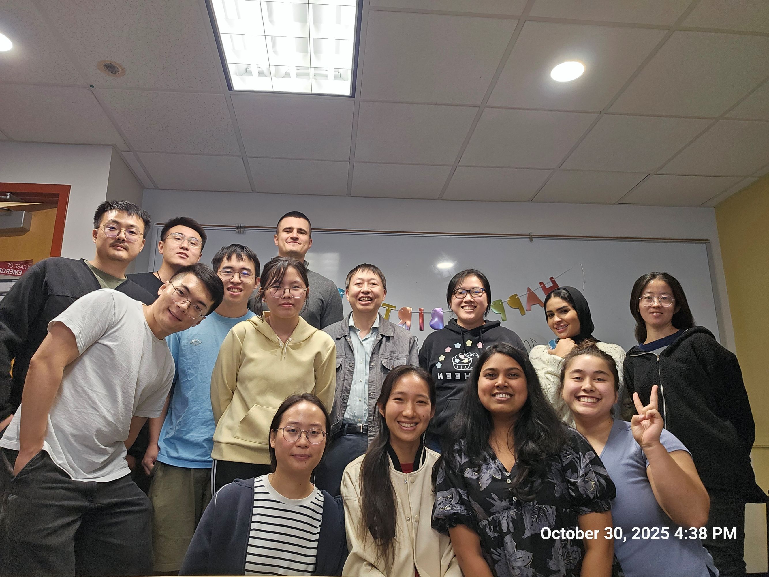 Thanksgiving party in Jianfeng's home. Also farewell to Cong (wish him the best), birthday party for Mentalla, Yu Yu, Haojie and Jarais. 11/22/2025. Farewell dinner for Cong, PhD celebration for Cong and Huaxuan, birthday party for Ritu on 06/26/2025. Wish them the best!. More pictures are shown here.Group meeting on 10/30/2025. We are celebrating Heng, Shuya and Jianfeng's birthdays. More pictures are shown here.SERMACS 2025, Orlando, FL, 10/26/2025-10/28/2025. More pictures are shown here.Farewell dinner for Bo and Yunpeng on 06/26/2025. Wish them the best!Farewell dinner for Yizhan on 03/07/2025. Wish him the best!Farewell dinner for Ziqi on 12/17/2024. Wish him the best!Group meeting on 12/06/2024Summer party. Also a farewell party for Yafeng and Emily. 06/01/20242023 Thanksgiving party. Also a farewell party for Songyi and Lei. 11/11/20232023 New Year home party, the first one after three years. Also a farewell party for Ruixuan. 01/01/2023Trip to Fort De Soto beach park, FL. 06/12/2022. More pictures are shown here.In-person group meeting after three years. 05/05/2022Farewell party for Mengmeng. Wish her the best in her future career. 9/21/2019Group meeting on 9/19/2019Farewell party for Peng Teng. Wish him the best in his future career. 2/12/2019Farewell party for Fengyu and Su. Wish them the best in their future career. Also party for temporary departure of Chunpu. Wish him back soon! 11/02/2018Group dinner celebrating Su's graduate award. 08/08/2018Group picture at group meeting. 2/01/2018Group Christmas party in Dr. Cai's home with Dr. Cai's BS and MS advisor Prof Lu and Prof Chen. Also Farewell party for Alekhya. Wish her the best! 12/09/2017Alekhya depicting group members in cartoon. 12/09/2017Farewell party for Wenbo. Wish him the best in China. 8/24/2017Trip to Fort De Soto beach park, FL. 06/24/2017. More pictures are shown here.Dinner gathering for Chao's temporary departure. 2/10/2017Christmas Party in Dr. Cai's home. 12/11/2016Dr. Cai's postdoctoral advisor Dr. Andrew Hamilton visiting our lab. Photo with some group members. 10/28/2016Group meeting. 10/13/2016We celebrate Alekhya's graduate award. 04/29/2016Group dinner on 07/23/2015Trip to Fort DeSoto Park, FL on 05/03/2015. More pictures are shown here.Yaogang's farewell lunch. We also celebrated Yaogang and Haifan's Ph.D. defense. 2/7/2015Party in Dr. Cai's home. 10/18/2014Shruti and Yaogang's farewell party. We also celebrate Yaqiong's graduate award. 04/22/20142013 Christmas Party in Jianfeng's home.Youhong's farewell dinner on 07/17/2013Trip to Fort DeSoto Park, FL on 05/19/2013. More pictures are shown here.Trip to Fort DeSoto Park, FL on 05/25/2012. More pictures are shown here.Zoya's artwork depicting people in BSF 341. 01/16/2012Christmas Party in Dr. Cai's home on 12/18/2010Christmas Party in Dr. Cai's home on 12/18/2010Trip to Fort DeSoto Park, FL on 05/14/2010.